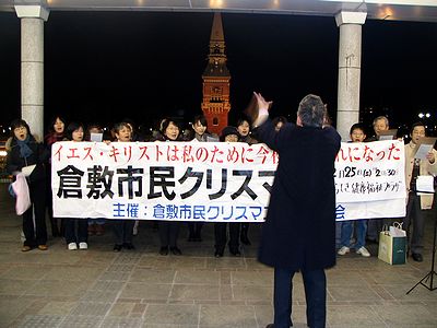 午後のおやつでおっとっとを食べていた全くんは「まぼろし」と言われている?(パッケージにはそう書いてある)鯛を見つけて記念写真を撮りました(左)。夕方6時には倉敷市内の教会が協力して倉敷駅でキャロリングでした。おとうさんが指揮で啓も賛美隊に加わりました(右)。全くんらは、25日に開かれる市民クリスマスの宣伝チラシとアロマキャンドルを駅を行き交う方々に配布するお手伝いをしました。