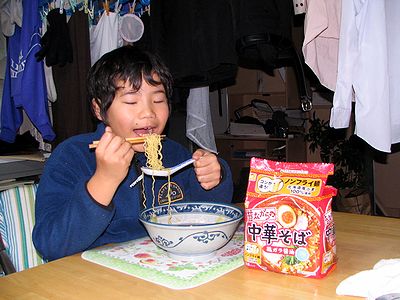 一昨日の教会ファミリークリスマス会で、全くんは交換プレゼントでインスタント・ノンフライラーメン(5袋入り)をゲットしました。「ノンフライだから僕も食べられる!」と大喜びです。個別懇談で帰宅が早かった今日の午後、そのラーメンを作っていただきました。「うんまー」と言いながらたいへんおいしく食べていました。ノンフライと言っても麺に多少の油は練り込んでありますから、全くんの体質では毎日食べるわけにはいきません。とりあえず毎月の誕生日(15日)に食べようということになりました。それから、このラーメン(残り4袋)は全くん以外が食べてはいけないことになっています。