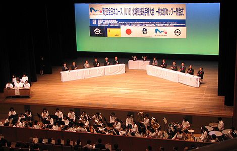第3回桃太郎カップ全日本ユース(U15)水球競技選手権大会の開会式が倉敷芸文館でもたれ、西中学校吹奏楽部が演奏出演しました。なんと、可動式舞台で作りだされる専用のオーケストラピットを使用しています。この日のためにここ数カ月練習を積んできました。