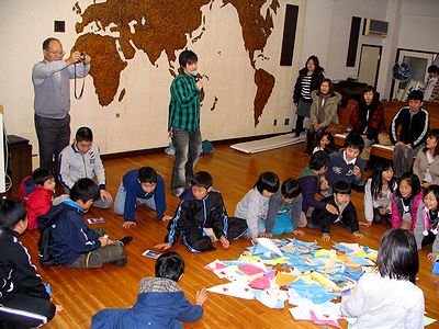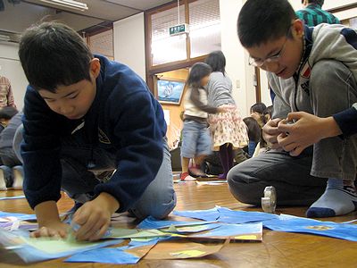 キッズクリスマスではたくさんのゲームやプログラムがありました。全部の写真は載せきれませんので、メインアクティビティーの「巨大紙芝居」の様子をピックアップします。8枚の模造紙に書かれたクリスマスストーリーがバラバラに切り分けられて一山になっています(写真左)。3人程度の8グループに分かれて、それぞれがパズルのように自分たちの担当の絵を再構成する(写真中)という活動です。完成したら今度は一番目の絵から順番にセリフを読んで全員でクリスマスのお話を完成させます(写真右)。大きな子も小さな子も協力して、楽しい活動になりました。そのほかビンゴでは全くんは昨日に続きまたまた賞品をゲットしました。賛美やハンドベルもあって、あっという間に2時間を過ごしました。
