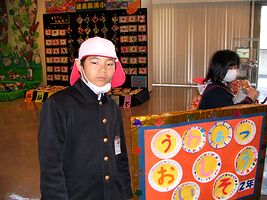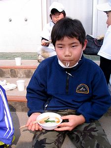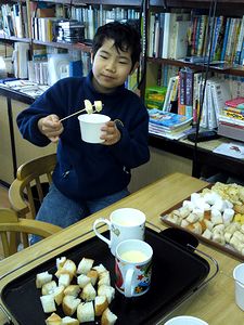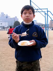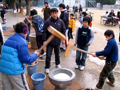 午前中は小学校では「いきいき子ども支援の会」主催の餅つきでした。全くんはできたてのお餅を6個食べて(写真左)、次に蒸しあがってきたお米をつかせてもらいました(写真中)。そのあとでまた2個、プラス雑煮で2個(右)いただき、計10個のお餅を食べました。さすがに「食べ過ぎた」そうです。帰宅して一休みしてから習字教室にも行きました。習字が終わって家にもどり、上靴洗いもすませて、やっとくつろぐことができた全くんは「今日はお休みの気がしない」と言っていました。