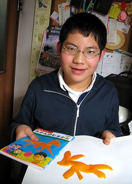 教会からの帰りに本屋に寄ったところ、「あたらしい みかんのむきかた」(写真で啓が持ってい本)がありました。本と、(別のお店で)みかんも買ってきて、啓が「うさぎ」を作ってみました。この本は、全くんの雑誌「小学4年生」に紹介されていたので、興味があったのです。本を読んでみると著者はキリスト教会の牧師先生でした。