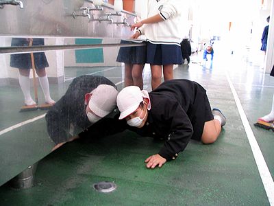 文化部の学校新聞作りで卒業が間近になってきた6年生の様子を撮りに行ったおかあさんです。昼休みのあとの掃除の時間になり、4年生が掃除をしているところに通りかかり、全くんをみつけました。流しの下までしっかり拭き掃除をしていました。