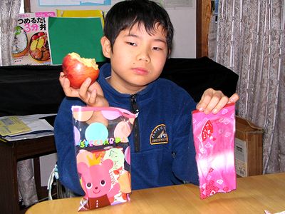 雪が降ったりやんだりの一日でした。夕方には倉敷にしては珍しく庭や道路が白くなっていました。その雪の中、中学校は参観日でした(写真左)。おかあさんがバレンタインデーにちなんで、全くん用にハート形お煎餅を食卓において出かけていたのですが、おかあさんより先に帰宅していた全くんは、おかあさんが戻った時にはすでに全部食べていました。写真右の全くんが左手に持っているのがその空袋です。ほかにおばあちゃんからもお菓子や果物を送ってもらいました。