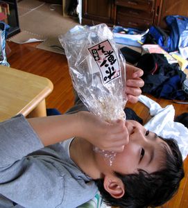 写真左は今日のおやつ時に米のポン菓子をラッパ飲みするように食べている全くんの様子です。このポン菓子、昨日の農マル園芸で全くんがおとうさんにねだってゲットしたものです。全くんだけのために買ったわけではなく、昨日は家族で少しずついただいたのですが、半分くらい残っていたものを全くんが今日全部食べてしまいました。