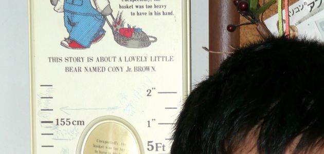 「目盛が振りきった!」という啓の声が聞こえたので、何かと思ったら、子ども用の身長計の一番上の目盛より啓は背が高くなっていたということでした(写真右)。目盛は158cmまであって、その部分クローズアップしたこちらの写真を見ると啓はそれより1、2cmくらい高くなっているようです。この4カ月で3cmほど伸びました。