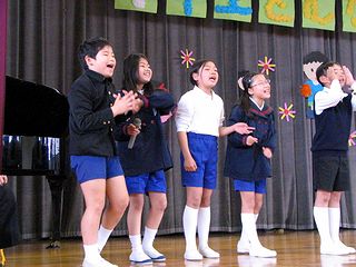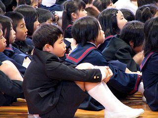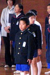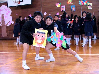 小学校の入学式でした。写真左は式が始まる前に校歌と君が代を練習しているところです。式のあとは式場(体育館)の壁に貼ってあった貼りものをはがす作業です(写真右)。5年生もなかなか忙しいです。
