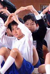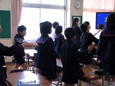 写真左は小学校での掃除の様子です。みんな黙々としっかり掃除をしていて感心です。写真右は今日の参観日で、国語の時間にモニター画面に映し出された漢字の書き順を全身(おもに右腕の動き)で表現しているところです。