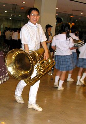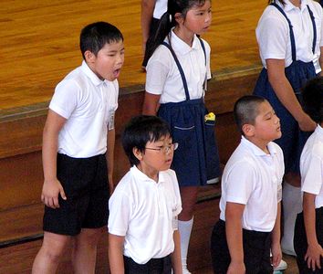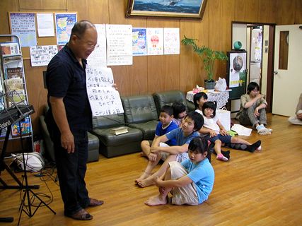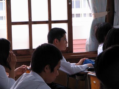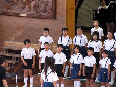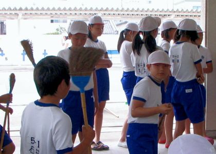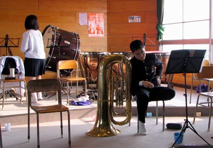 昨日は忙しくて更新できませんでした。本日(3日)分も翌日になっての更新になりました。写真左は小学校のプール清掃作業の様子です。前日に先生たちが水抜きとか大方のところをしてくれていたので、この日はあまりたいへんな作業ではありません。右は中学校の部活参観日で、合奏練習前の音楽練習室の様子です。