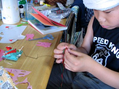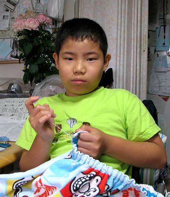 小学校の家庭科で縫い物をならっている全くんです。それで今週末の「自主学習」の宿題は手芸でウサギのマスコット作りに取り組むことにしました。今日は良い天気でとても暑くないました。アパート3F(最上階)の我が家ではエアコンをかけないと室温が35度まで上がりました。そこで全くんは保冷剤をタオルにまいて鉢巻きにして(写真)頭を冷やしながら作業を進めました。