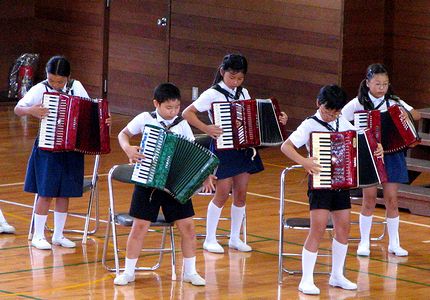 全くんたち5年生は、全校朝礼の「さわやかコーラス」の時間に6月のうた「明日は晴れる」の歌唱リードをする日でした。また器楽演奏で「アフリカンシンフォニー」の披露もありました。こちらではアコーディオンを担当した全くんです。右下は昼休みに、月一回活動する1〜6年生縦割りの「ふれあい班」で遊んでいるところです。