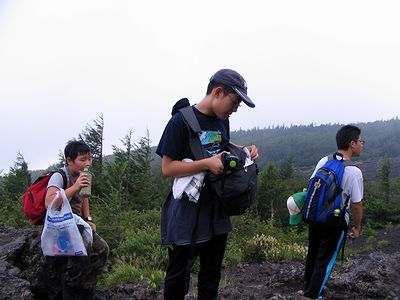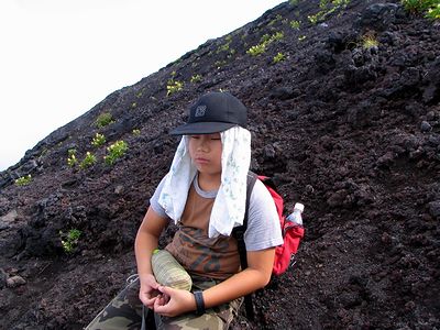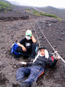 | 6合目をすぎ、まもなく木がなくなります。 | 今日の目標、7合目の山小屋まであと少し。かなりくたびれてきました。 |