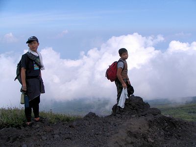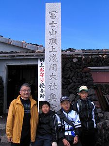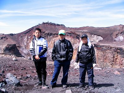 | 午前9時山頂に到着!みながんばりました。 | 火口とその向こうに剣が峰を望みます。 | 砂走りを駆け下りて午後2時に登山口に戻りました。 |