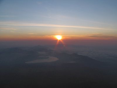 | 午後4時、山小屋に到着。夕食は午後5時です。外気温は10度を下ります。 | 10日午前4時40分山小屋出発。20分ほど歩いて登山道からご来光を見ました。 |