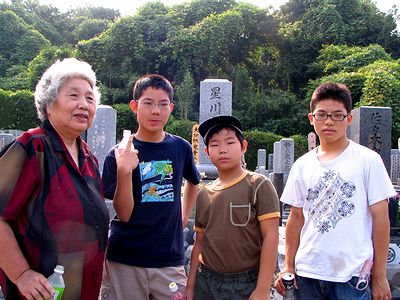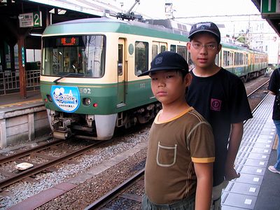以下の写真1枚目は13日の墓参り、その他の写真は13日午後の江ノ島の様子です。江ノ島にはたくさんの海水浴客、観光客が来ていました。にぎわう様子を見て子供たちは「お祭りみたい」と言っていました。江ノ島の最高点には展望灯台があります。そこまで通常は石段を歩いて行くのですが、今日はエスカーという有料エスカレーターを使いました。富士登山での足の疲れが、おとうさんにまだ若干残っているためです(年をとるほど回復が遅くなります^^)。途中でちょうど来ていた猿回しを見物しました。サムエル・コッキング苑(庭園)と展望灯台見物の後に岩屋洞窟を見て、さらに磯で遊び、船で本土側に戻りました。まさに観光客コース!帰路は江ノ電に乗ったのですが、駅に向かう途中に江ノ電ショップがありました。江ノ電の営業努力がわかります。