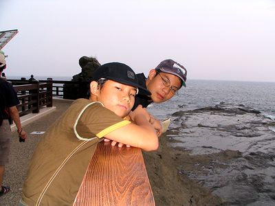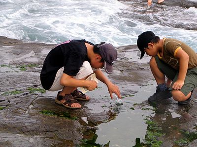| 岩屋洞窟に向かうデッキで。 | 磯でカニを捕まえようとしますが・・・・。 |