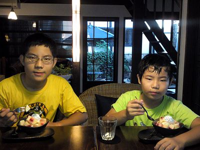 倉敷市の小中学校は明日31日から授業再開です(年2学期制なので、明日はあくまでも「前期」の再開ということです)。今日が夏休み最後の日になります。ということで(?)、夕方に美観地区をおとうさんと散歩して、いつもは食べさせてもらえないよう、豪華なパフェを特別にいただきました。