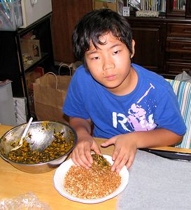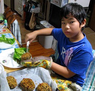 台風は倉敷に上陸しました。我が家周辺で被災はなかったようですが。風よりも大雨と洪水で県内外では被災された方々があったようです。お見舞い申し上げます。 今日は礼拝後に、昨日見に行けなかった倉敷ライフセンターに展示された全くんの作品を見に行きました。帰路に食料品を買い、全くんがお手伝いして(写真右)かぼちゃとヒジキ、ひき肉の焼きコロッケ作りをしました。