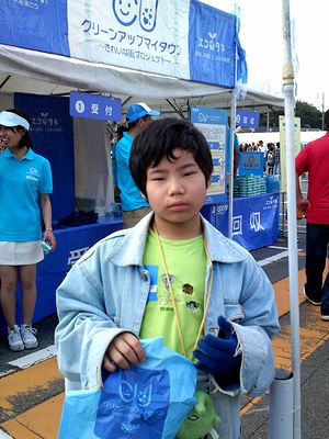 繊維の町である倉敷市児島地区の通称「せんい祭り」(正式には せんい児島「瀬戸大橋まつり」)に行ってきました。デニムジャケットやカーペット、学生服の替えなどを安く買うことができました。なかなかの盛況でした。写真は会場で即席の清掃ボランティア(?)をした全くんです。