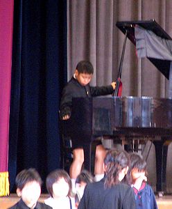 11月の学校音楽祭に向けて5年生は朝練習が始まっていますので、全くんは早くに出かけます。昨日道路の半分を舗装しなおしていましたので、横断歩道の半分が書かれていません。今朝の練習は体育館をつかってのものでした。写真はピアノ担当の全くんが練習後にグランドピアノを片づけているところです。