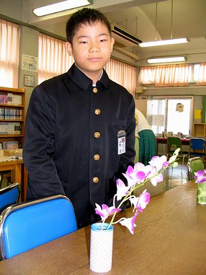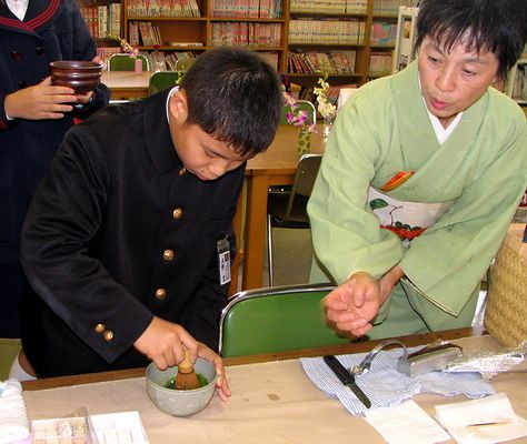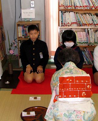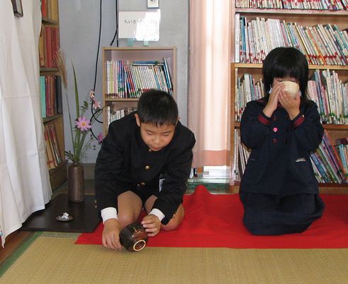 小学校では、地域の方々の協力による「ふれあい体験学習」です。昨年は昆虫ワールドに参加した全くんは、今年は「お花とお茶」のクラスに参加しました。図書室を会場にしました。お花は茶席のものなので一輪差しです。お茶の立て方も習いました。茶菓子をいただき、茶器を鑑賞することも学びました。