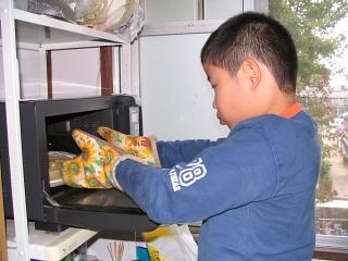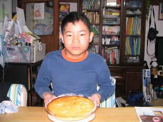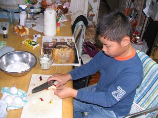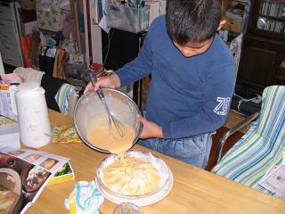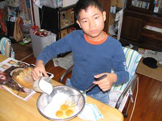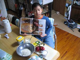 土曜日(ふれあい体験学習)の代休だった全くんです。山形の大おばちゃんから送ってもらった紅玉リンゴを使ってリンゴケーキ作りに挑戦しました。その様子をおかあさんに写真に撮ってもらってプリントしてノートに貼り、宿題のひとつだった「自主勉強」の成果として明日提出することにしました。