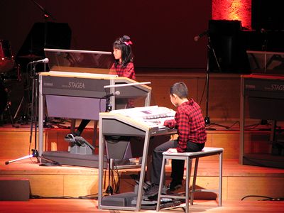 エレクトーンアンサンブルコンテスト本番での演奏(上段)、演奏終了後に先生と一緒の記念撮影(下左)、コンテスト結果発表の様子(下右)です。全くんたちは普段の練習以上の演奏をできましたが、残念ながら賞をもらったり、上位大会へ進出することはかないませんでした。演奏技能のコンテストに初参加ですからね、練習の成果を発揮できただけで十分です。