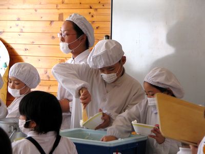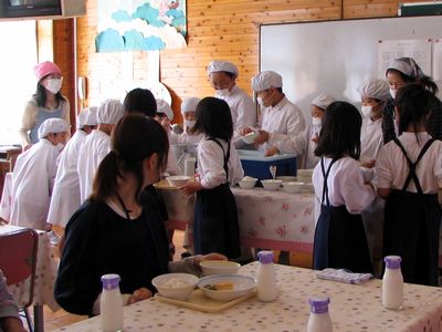 小学校では1年生が親子給食でした。通常は6年生が給食のお手伝いに入るのですが、今日から6年生が修学旅行なので、5年生が代わりをすることになりました。自分のクラス(5年1組)の給食当番ではなかった(非番の)全くんが1年生のお手伝いをすることになったわけです。