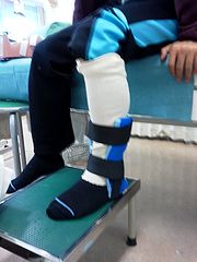 昨日、山の上に立っている高校から下山・下校する途上足をひねった長男です、今朝になって痛みがひどくなったと言うので病院に行きました。診断の結果、靭帯損傷ということで患部を固定してもらいました(写真)。おかげて、その後は(ひねらなければ)痛みはないということです。