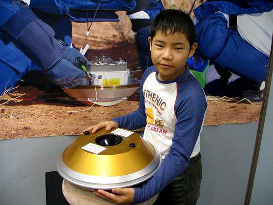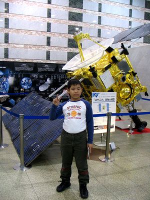 小惑星探査機「はやぶさ」の帰還カプセル、パラシュートなどの実物展示に行ってきました。倉敷では昨日27日から4日間の展示です。実物は写真撮影禁止なので、触ってもよいレプリカの帰還カプセル(写真左:本物をオーストラリアで回収している様子の写真パネルの前で)や実物大模型の前で記念撮影です。