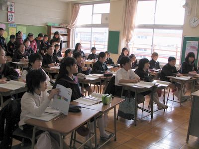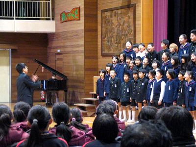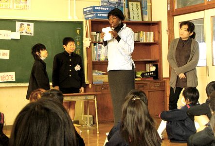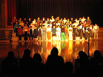 とても寒い一日で昼間には雪もちらつきました。小学校は学芸会の予行演習でした。衣装をつけて山椒太夫を演じている全くんです。