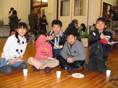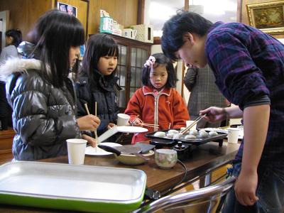 今年1回目のキッズクラブでした。賛美あり、聖書の「善きサマリヤ人」から題材をとったスキット(寸劇)あり、メインはお餅です。いそべもち、きな粉もち、あんこもち、など定番からピザもち、チョコレートもち、お好み焼きもちなどの新しいものまでたくさん食べました。総勢80名ほどになり、用意した5升のおもちが足りなくなるほどでした。最後に(写真ありませんが)ビンゴでもう一度盛り上がって、楽しい2時間があっというまにすぎました。