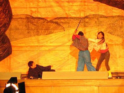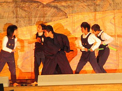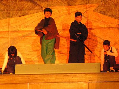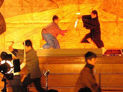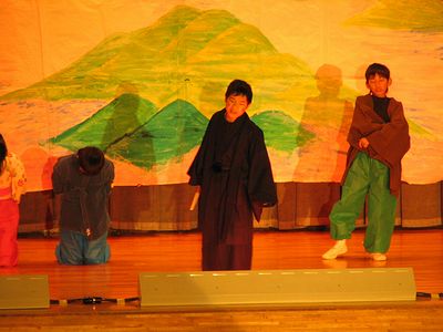 インフルエンザで「山椒太夫3」役の生徒が出られなくなり、急遽「山椒太夫1」の全くんが「3」もやることになりました。ずっと練習をしてきたのに本番に出ることができなかった生徒はとても残念だったでしょう。その子の分も全くんはしっかり果たして、立ち回りも代役とは思えないくらい、ちゃんと決めていました(写真)。全くん本人も満足したできだったようです。