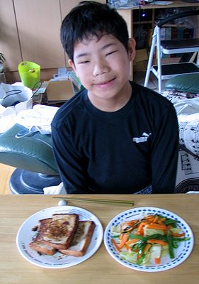 小学校の宿題が「家族のよろこぶ朝食をつくろう」ということだったので、全くんはクロックムッシュと野菜炒めを作りました(写真左)。クロックムッシュはおとうさんが休日の朝に時々つくるのを食べて気に入り、全くんも最近自分で作るようになっていました。我が家のクロックムッシュは中身がチーズのみ、パターで焼いただけでのシンプルなものですが、これが結構美味しいのです。