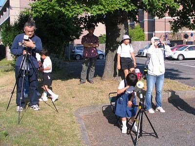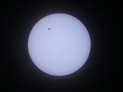 今日は朝からよい天気で金星の太陽面通過を最初から充分に観察することができました。写真は宿舎前で観察する様子と拡大した太陽の10時半くらいの様子(黒い丸いのが金星)です。黒点もいくつか見えました。