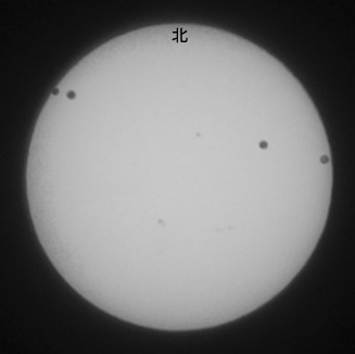 昨日の写真左を差し替えました。太陽面を通過する金星を4枚合成で示してみました。金星は左から7時30分、7時55分、10時56分、13時27分のようです。