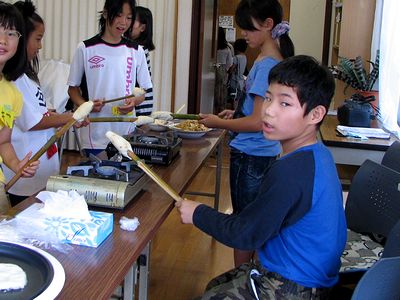 「山の学習」は天候にも恵まれてキャンプファイヤーなどすべてのプログラムを予定通りおこなうことができて、金曜日午後、全くんは元気に帰宅しました。今日(土曜日)はキッズクラブがありました。パン生地を棒に巻いて、炭火で焼いて食べるというアクティビティーです。夕方は今度は中学校吹奏楽連盟の吹奏楽祭で啓くんたち西中が出演しましました。