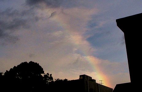 台風4号の接近で明け方から激しい雨が降り、大雨警報が出たので高校は休校になりました。小学校中学校は給食が止まり午前中の授業だけで下校してきました。 台風は予想より早くに進み、倉敷では特に被害はなかったようです。夕方には岡山県は台風の影響から外れて夕方には虹がでて夕焼けとなりました。画像はコントラストや彩度などを強調処理しています。