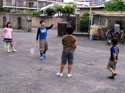 写真は今日の午後、宿舎前庭でこの宿舎に住む子どもたちと一緒にバトミントンをしている全くんの様子です。