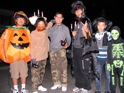 昨日のハロウィーンの仮装です。たくさん子どもたちが参加しました。全員での集合写真ではどこにだれがいるのかわからないので、数人で撮ったものを載せます。次男は仮装せず自宅で配る側をしましたが、あとで結局各家庭からお菓子をもらっていました。