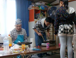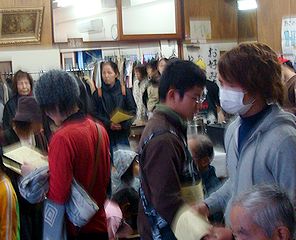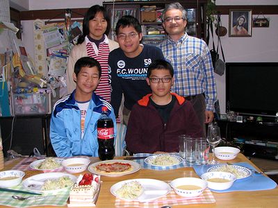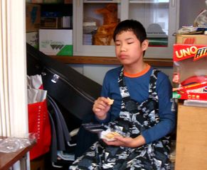 教会バザーでした。雨天にもかかわらずたくさんのお客さんが来てくれました。写真左は最初の礼拝が終わり、いよいよバザー会場がオープンするところです。このあと次男は午前中にオモチャ担当のおかあさんを手伝い、お昼過ぎから数学検定を受けに中学校にいきました。午後から三男が次男に代わり(おやつを食べながら)オモチャ売り場で店番をしました(写真中)。長男はおとうさんと一緒に焼きそば担当です(写真右)。
