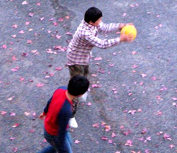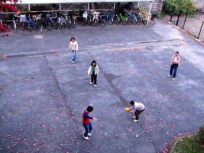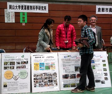 礼拝の後、市内福田公園で行われたくらしき農業まつりに行ってきました。研究所の展示が出ていたのです(写真左)。夕方は宿舎前庭で子どもたちに大人も混じってドッジボールで遊びました(写真中、右)。