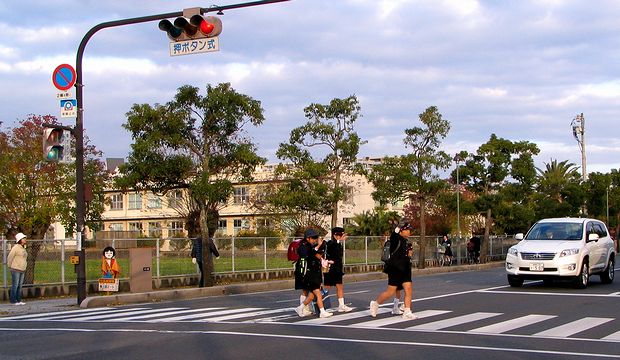 小学生の登校風景です。写真は正門前の横断歩道を渡るところです。今日は校門前で校長先生やあいさつ当番の生徒に加えて、お巡りさんも参加して生徒たちを出迎えていました。