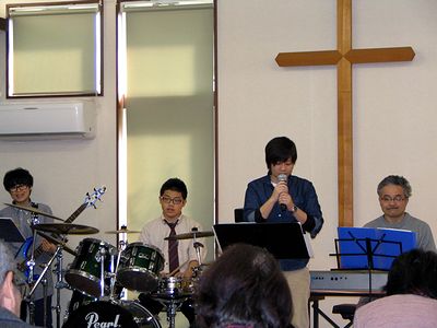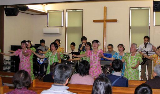 教会では震災支援チャリティーコンサートでした。岸先生(写真下段右)のサクソフォーンとメッセージを中心に、フラ(写真上段)もあって、たくさんの方が参加してくれて、また義援金をいただきました。おとうさんはキーボード、長男はドラムでフラや会衆賛美の伴奏に参加しました。