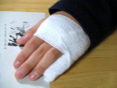 日曜日に手をついたはずみで左手小指を痛めた全くんです。本日夕方に病院に行き、小指靭帯が伸びたという診断で固定のための資材(そえ木・・・実際は樹脂製)を作ってもらい包帯で巻いて帰宅しました(写真右)。今日の昼間は学校でボール遊びをしていました(写真左)が、本人は「左手を使わないようにしていた」そうです。