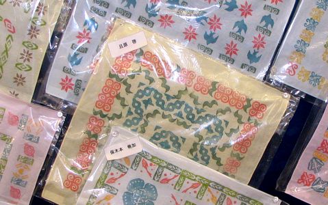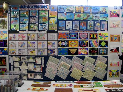 今日まで市立美術館で開催されていた「倉敷っ子美術展」で倉敷西中学校の展示スペースに次男が作成したスタンプ染色の布が展示されていました。模様ハンコをまず自分で彫って、それを並べる順番を考えてハンカチに押していくというものです。3年生300人超が作った者の中から選ばれた15作品ということです。