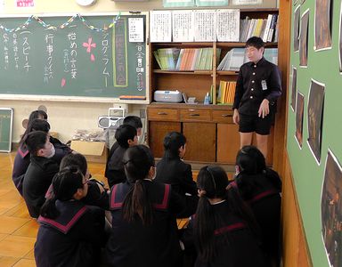 写真は小学校の参観授業で英語のスピーチをする全くんです。英語を話す時は手ぶりがつくようで、全くんの左手も動いています。