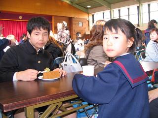 先週金曜日、小学校授業参観のあとで開かれた「友愛セール」でシフォンケーキを買っておやつにした全くんです。同じ宿舎にいて一緒に登校している1年生と同席しました。
