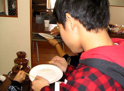 教会ではキッズクラブでした。子供たちが80人くらい集まって大盛況でした。上段はじゃんけゲームをしているところです。今日のメーンはチーズフォンデュー(下段左)、チョコフォンデュー(下段右)でした。チョコだけでなくてチーズも子どもたちに大人気でした。
