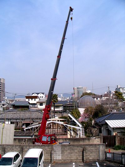 私たちが住んでいる宿舎の前(北側)に倉敷天文台があります。彗星の発見/観察の我が国のパイオニア・本田実氏の本拠地です。建物が老朽化して、また耐震補強のこともあり、観測所を建て替えることになりました。旧建物は歴史的なもので文化財指定も受けているので、移設して保存することになりました。数日前から移設の作業が始まり、今日はクレーン車が来て屋根を釣りあげてトレーラーに移していました。子どもたちは登校中の出来事で、おかあさんが撮影しました。